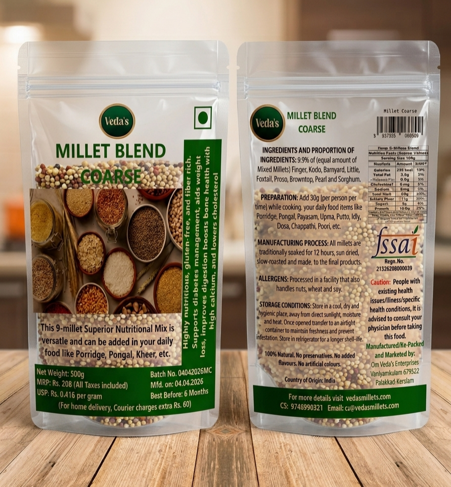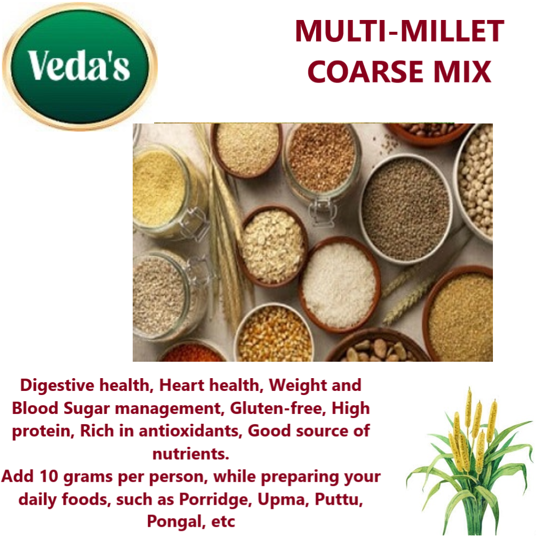 Veda’s multi-millet coarse, semi-coarse and powder blend is a unique product combining 9 millets – Finger, Kodo, Barnyard, Little, Foxtail, Proso, Browntop, Pearl, Sorghum for daily use in your foods.