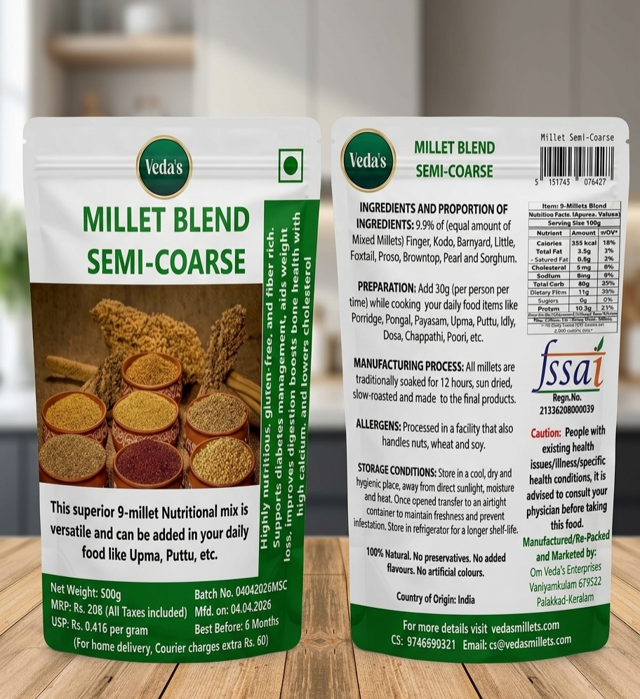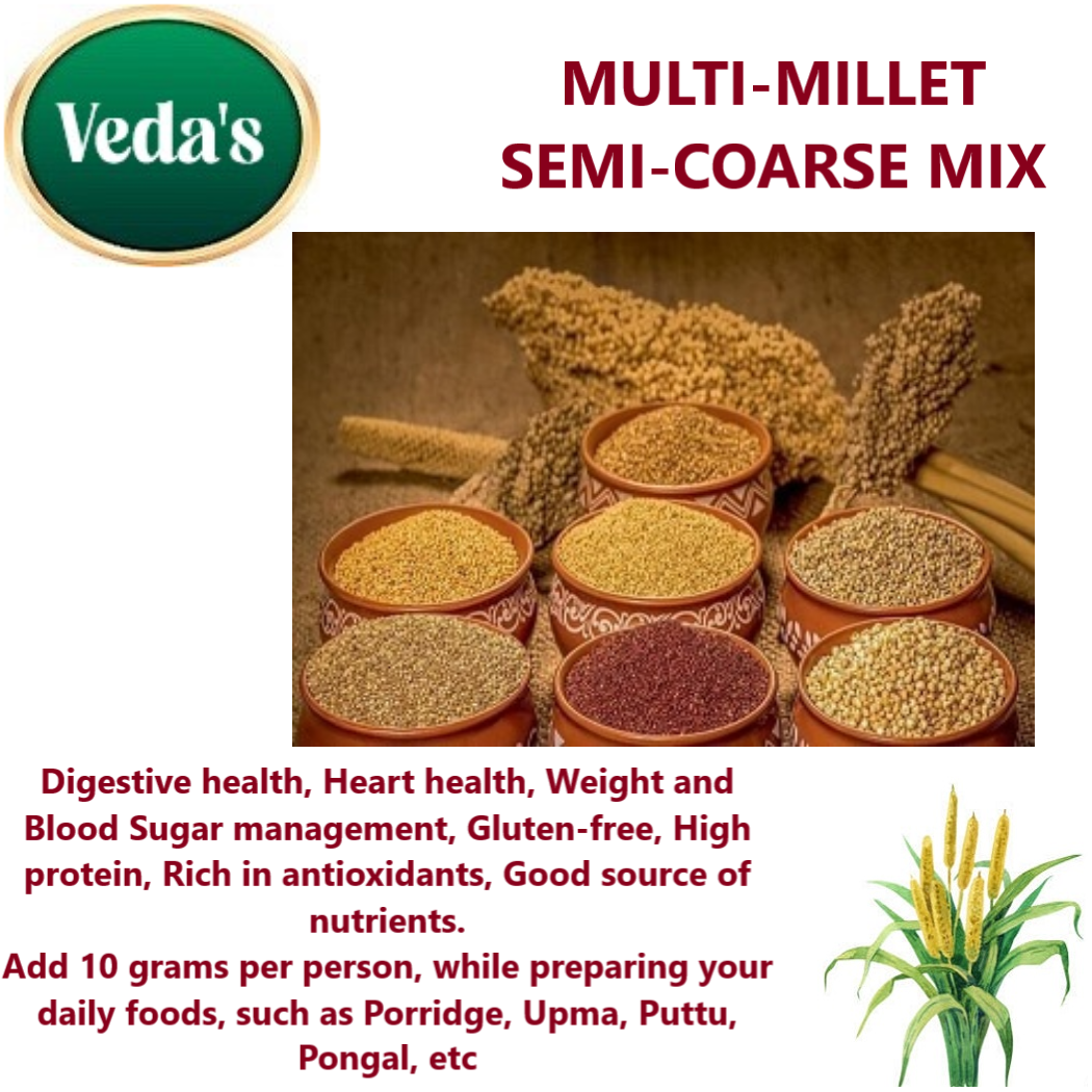 Veda’s multi-millet coarse, semi-coarse and powder blend is a unique product combining 9 millets – Finger, Kodo, Barnyard, Little, Foxtail, Proso, Browntop, Pearl, Sorghum for daily use in your foods.